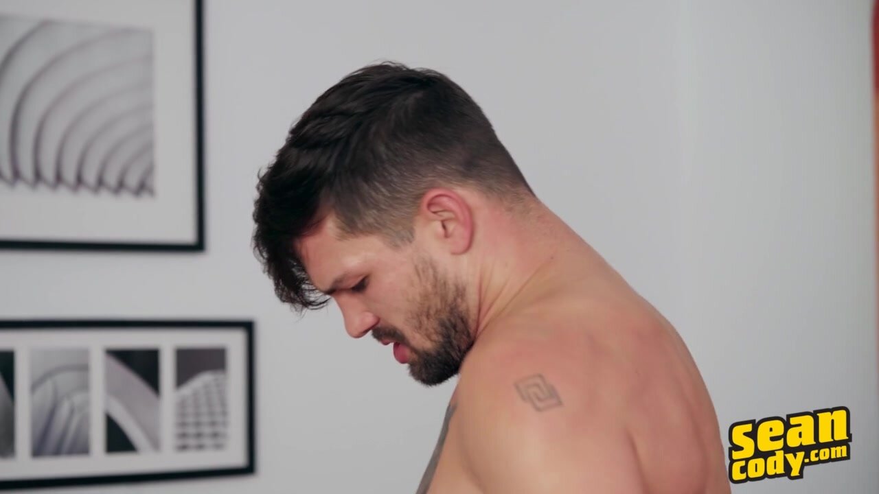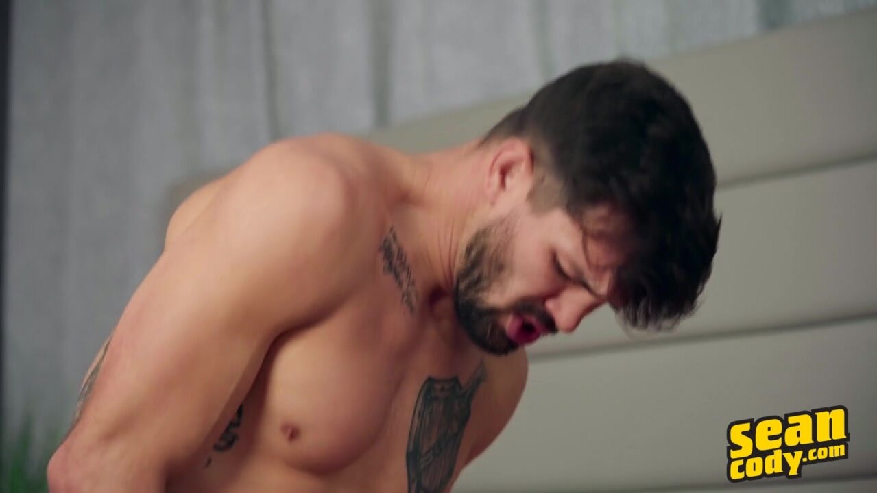 Stud Brysen doesn't take his time about undressing tattooed bad boy Dave and sucking his cock while fingering Dave's hole, and Dave wants Brysen's cock inside him. The power bottom demands that Brysen fuck him harder as he gets pounded in missionary and doggystyle, and even after ultra deep pile driver, Dave's hungry ass craves even more. "You filled me up. The hole wants more," Dave taunts, with Brysen's cum still on his face. "I'm sure we can arrange that," the top replies with a grin.