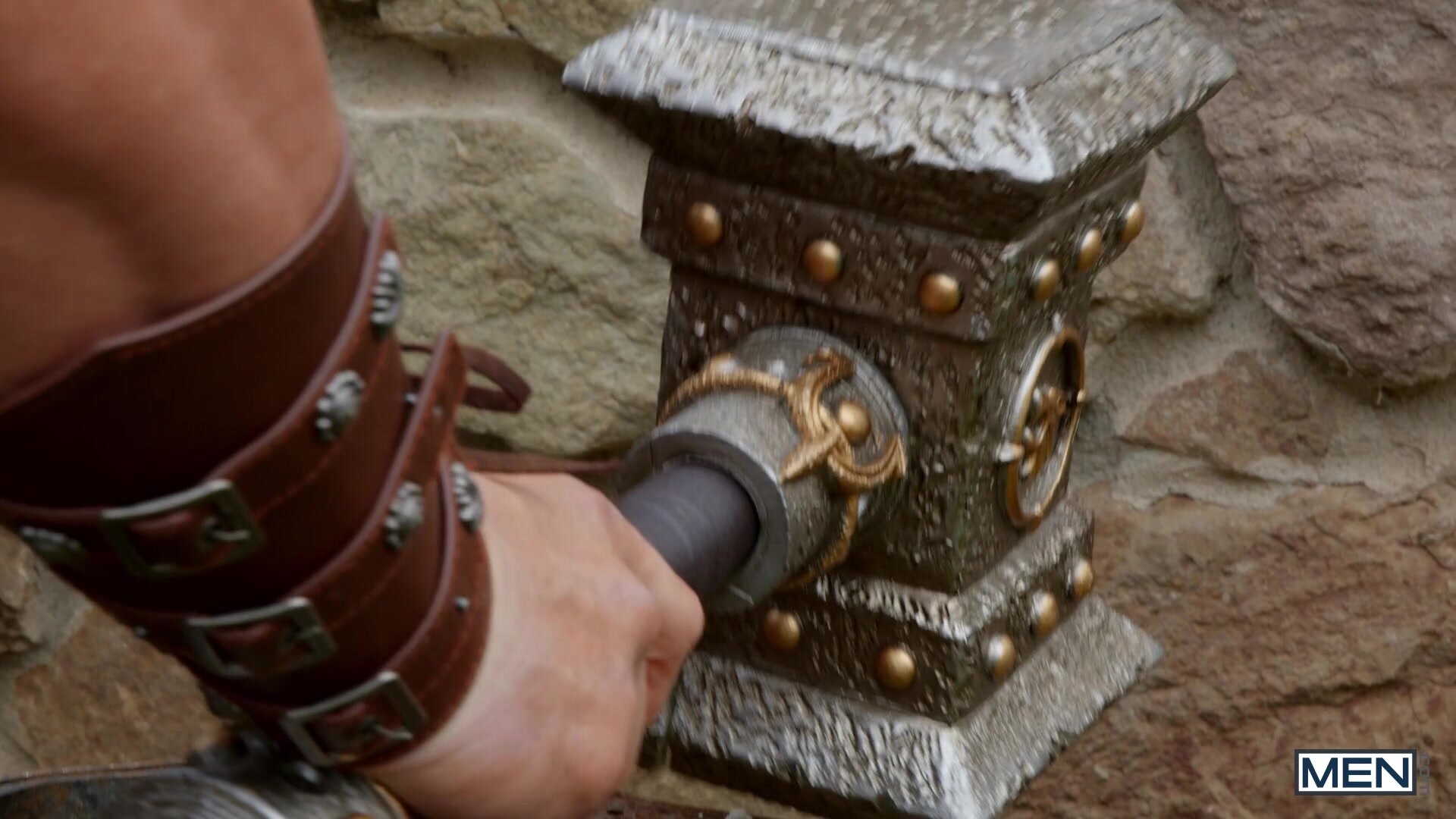 In exchange for a temple built to his eternal glory, the Norse god of chaos Loki (Felix Fox) agrees to voyage across the seas to find Thor, god of thunder, the only being strong enough to stop Dracock the Dragon from destroying the Norse lands. Thor (Malik Delgaty) has found his peace living a simple life as a blacksmith with a human wife, and doesn't want to return... until he finds Loki teasing his hole with the metal cock he forged. Loki's mouth around his godly dick reawakens Thor's hunger for glory, and for his tight hole. Thor pounds the god of chaos doggystyle, then Loki rides the top's cock. The trickster cums as he gets drilled in missionary, then Thor shoots a thunderbolt on his face!