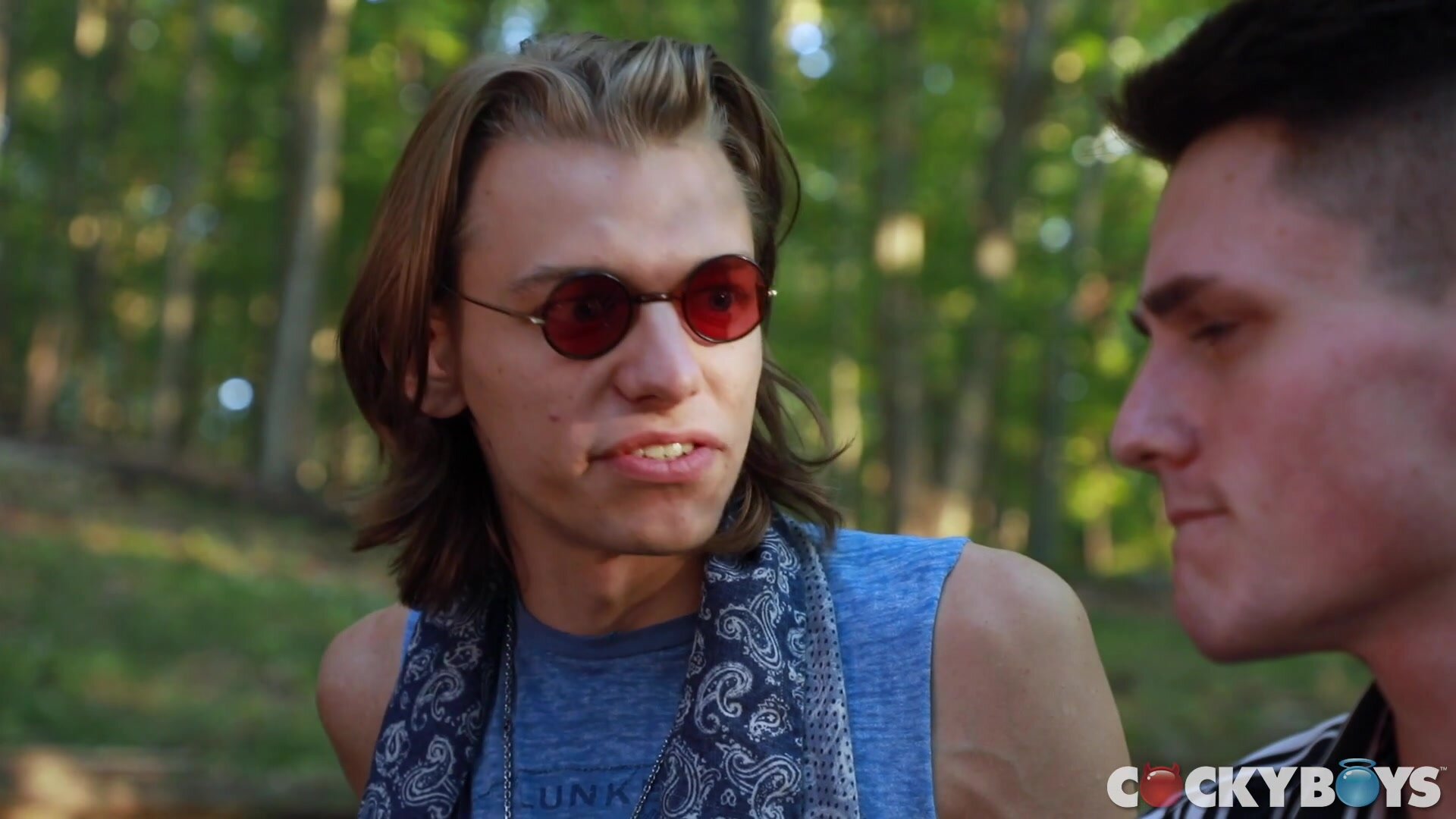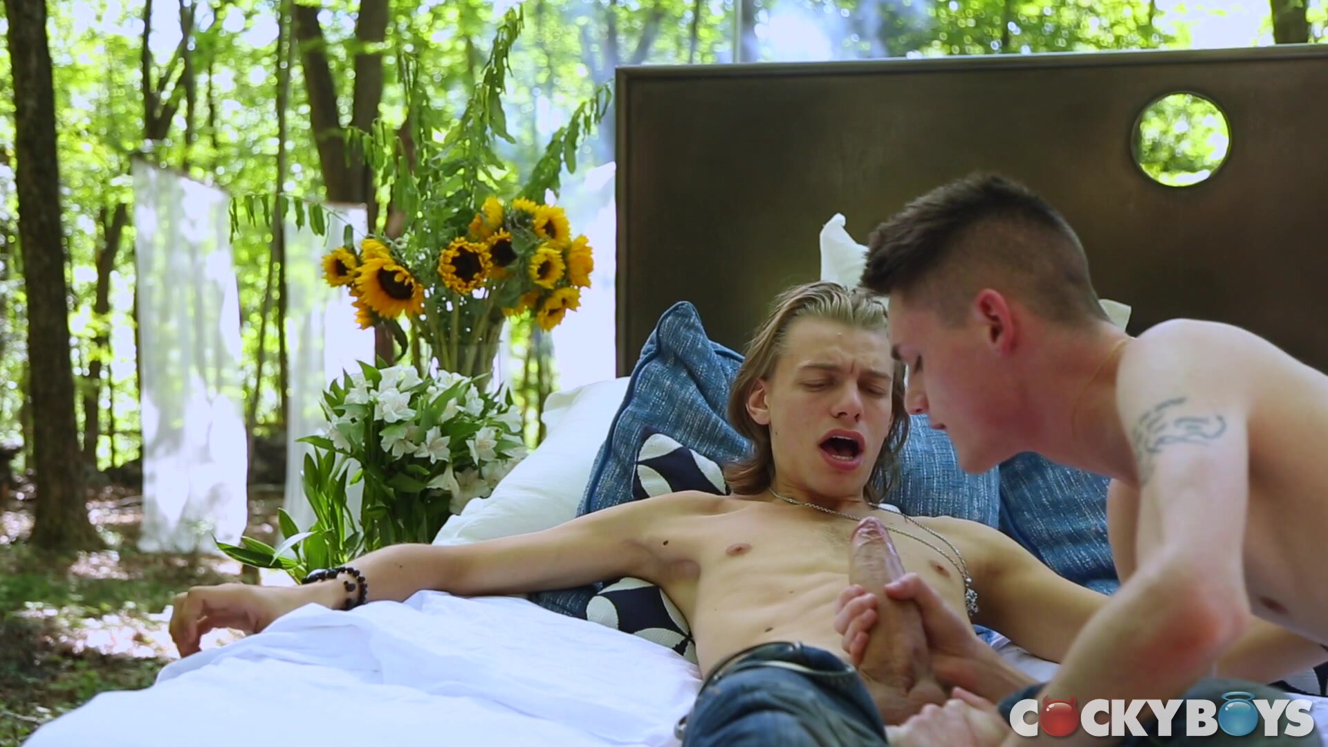Leo's steady deep fucking is just what Avery wanted and he takes it all--on his back and from the side before Leo fucks him up against a tree. He pounds and stretches out Avery and doesn't quit until he fucks a load out of him. Making Avery cum pushes Leo over the edge and he pulls out to shoot his massive load. He pumps his cock back into Avery who fucks himself back on Leo before they make out.