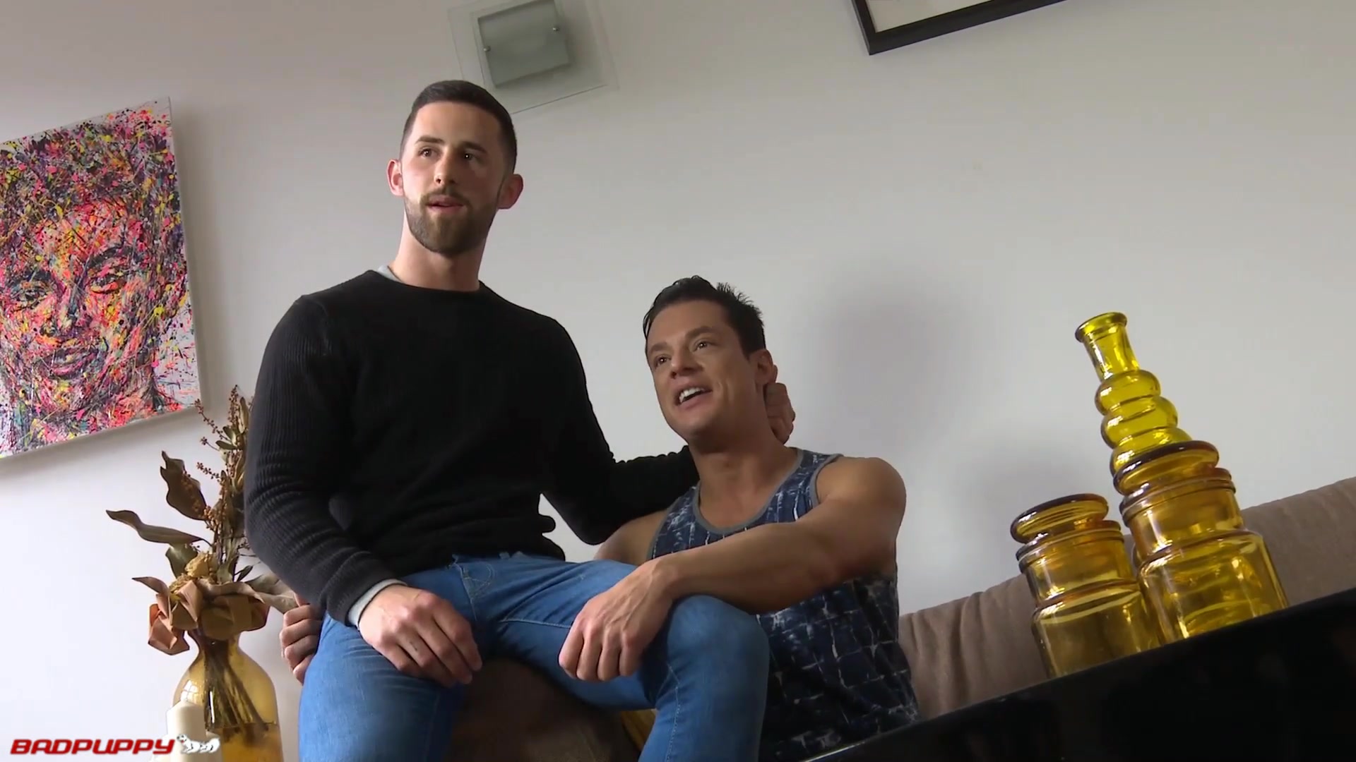 We fade in on Spanish stud, Sunny Colucci and Rex Cameron chatting on the sofa. The chatting does not last too long as these two studs start passionately kissing each other. They slowly strip off each other shirts revealing their much chiseled features. Rex climbs up onto Sunny’s lap and the face kissing continues between the two of them. Sliding down to the floor, Rex reaches up and loosens Sunny’s pants, pulling them down just enough to allow his thick dick, which is already standing at attention, to jump up and slap his stomach once released from the confines of his jeans. Rex wastes no time in swallowing Sunny’s cock all the way to his balls, gagging most of the time due to Sunny’s size. Sunny motions for Rex to join him on the sofa and Sunny helps Rex loosen his jeans freeing Rex’s cock from its confines and Sunny swallows it all. As he is sucking Rex’s cock, Sunny is also using his fingers to loosen up that ass he plans on filling. Rex leans over the sofa pillows offering his ass which Sunny fills with his thick cock and once inside he begins fucking Rex’s ass like there is no tomorrow. These two studs find four different ways to fuck each other before Rex, who is now covered in sweat, grabs his cock and with a few strokes blows his thick creamy load of cum all over his six-pack chest. Of course this puts Sunny over the edge; he pulls out, and while jerking his cock, shoots a stream of jizz all over Rex’s cock, stomach and chest.