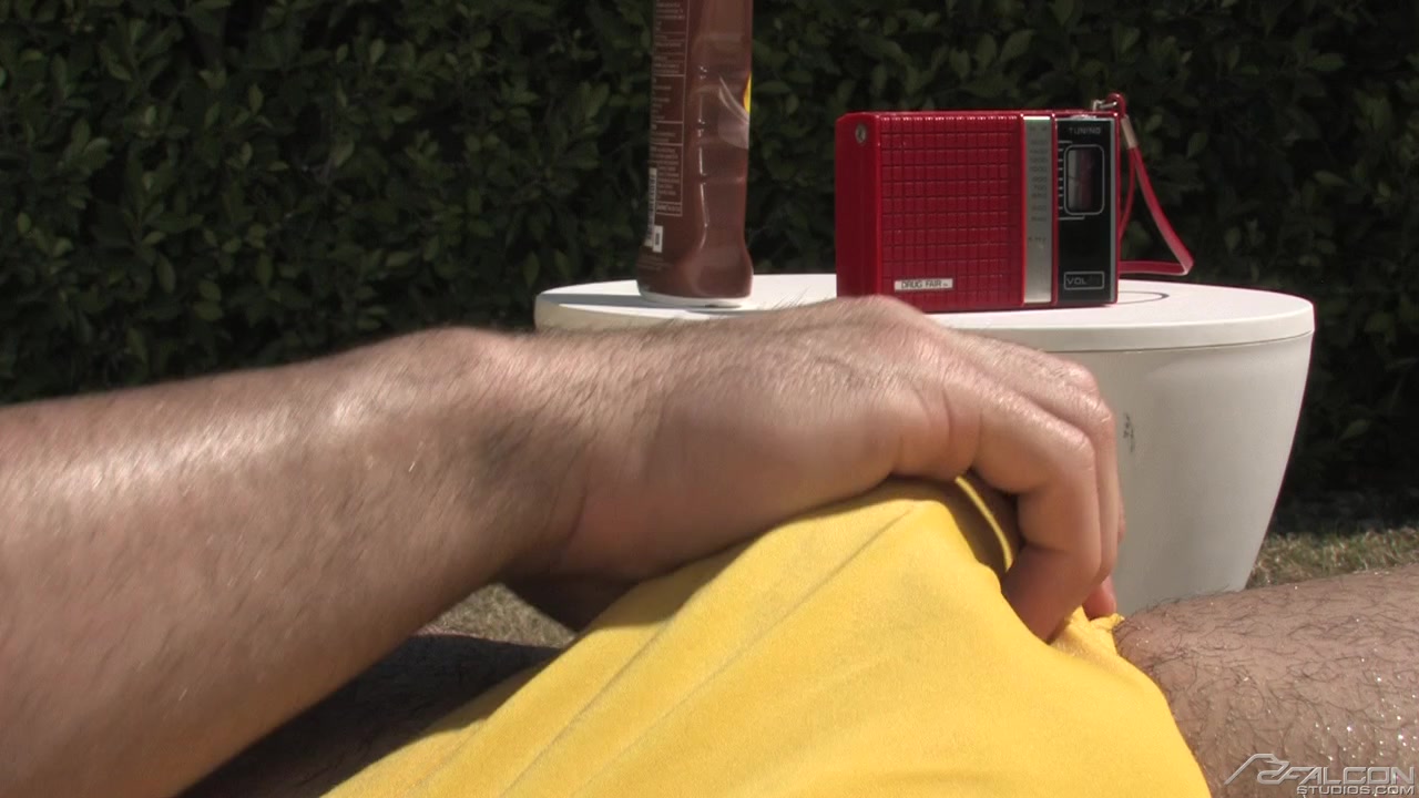 Angel Rock offers living, sweaty proof that a man's best friend is...his hand...while basking in the California sunshine. His compact body is convex in all the right places, covered with barely clipped dark hair, and muscled from collarbone to calves. His bright yellow swim trunks and towel are the perfect complement to his tan. The sunshine triggers lens flares in the dark glass of his Ray Bans and the tiniest pool of perspiration has collected in the hollow of his throat. Biting his lower lip, Angel strokes his cock with SP35, using more strokes than necessary to keep out the UV rays. He cups and squeezes his balls with his free hand, then plays with his foreskin, pulling it over the head of his dick until you can't tell pre-cum from sunscreen. When he grabs his fully engorged cock in both fists, you get a better idea of its size: two hands can't contain it. Dripping sweat and lube, Angel jacks off to beat the band, fucking the air, fingering his hole, and climaxing with bursts of spooge that puddle on his tummy -- all of which brings a wide grin to Lance Luciano, who has been secretly filming him.