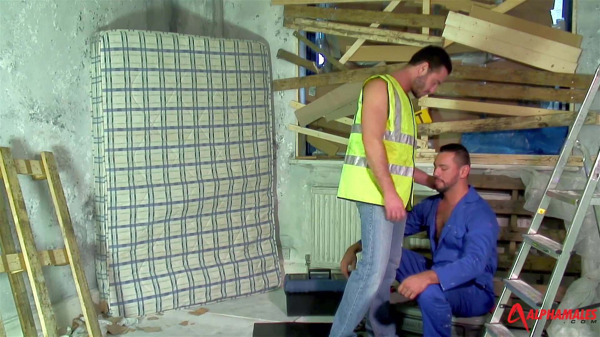 Jessy arrives at the site and finds Tiko already waiting for him. The job has been on hold for a few hours already . What’s an extra half hour? Jessy walks up to Tiko, pulls him up and they get to business. They explore each other’s mouths and taste each other’s skin until their cocks are rock hard and swinging freely. It’s Tiko that takes the lead and drops on his knees to taste Jessy’s cock and balls, and it’s a nice tasty set. Jessy loves his balls licked but he loves to suck cock too, so he pulls Tiko up and then pushes him back down so he can wrap his lips around the man’s dick. It is only natural for a top like Jessy to slowly move down and eat Tiko’s ass. And he is very good at it because Tiko decides to let Jessy fuck him in the same position. Tiko is not used to the feeling but he lets himself go and enjoys feeling that cock push his ass open. But Jessy has one more itch to scratch and moves to the stepladder presenting his own ass to Tiko. He drops down on his knees again to eat that hole and then stands up to fill it. Jessy gets fucked till his ass is about to drain Tiko’s balls. They both unload on Jessy’s hairy torso.