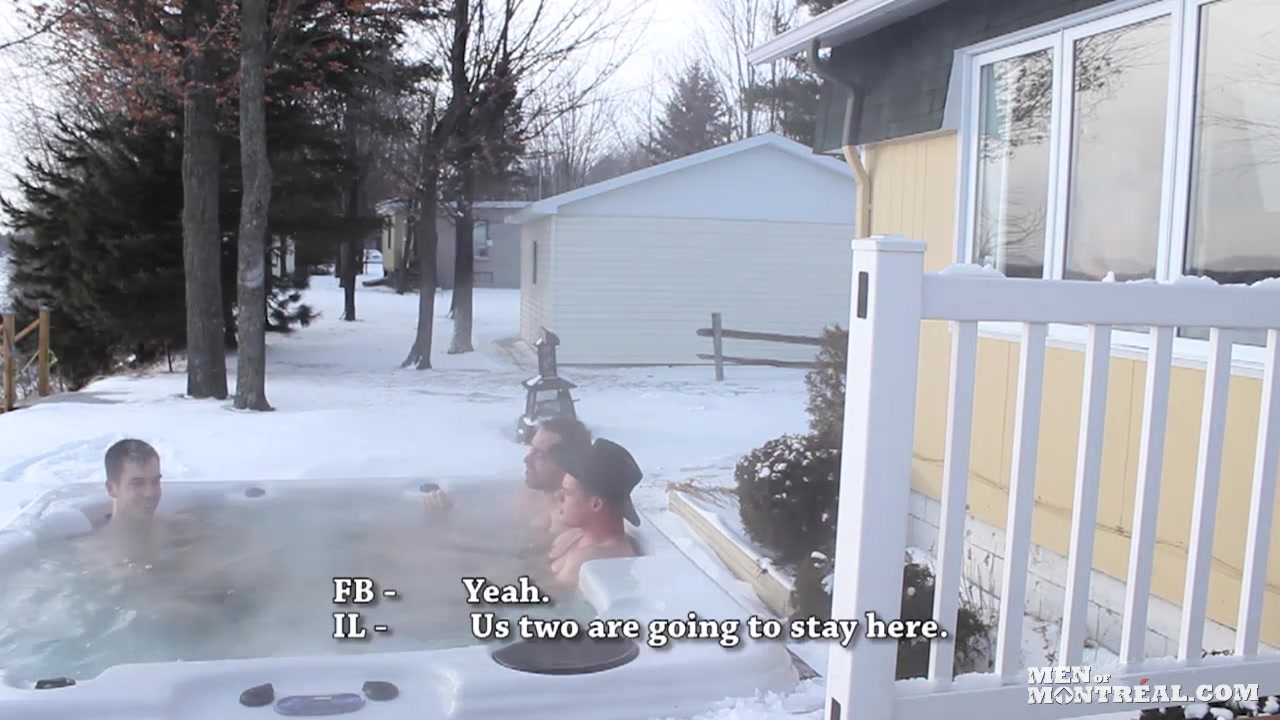 The scene started in the hot tub the morning after the guys' evening of crazy antics, card games and table football! Things got going with the four relaxing in the outdoor hot tub with the sun beaming down. While the skies were blue and the surroundings beautiful, it was a bone chilling -25. So, things moved inside quickly, as one guy after the other made his way back in the cottage with a boner in hand.
