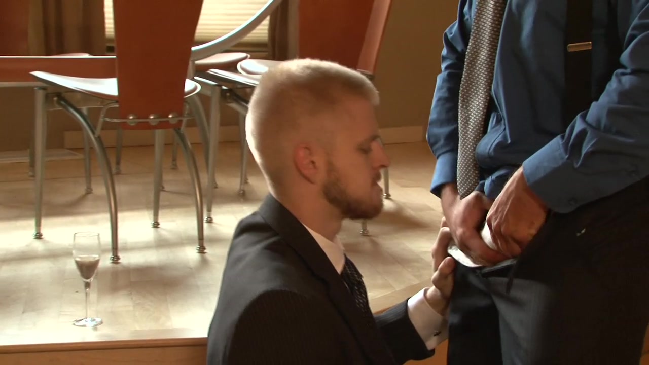 A toast to business partners: beefcake executive Robert Van Damme and slender, blond wunderkind Logan Stevens seal a business deal the only way two hot guys should: with hard, intense gay sex! There's some kissing, but it's mouth-to-cock contact these to hunks are truly after. It's Robert's turn first -- he pulls his pants down and reveals the thick, uncut cock hanging between his legs, which Logan gobbles right up. He swallows all of Robert's dick, going right down to his balls -- Robert even hold Logan's head to force his bottom's throat! The pair flips and Robert dives onto Logan's cock, which stands erect and tall. But it's not oral sex that's going to totally seal this deal: Robert is a power top, and he demands further payment from Logan. The blond cutie bends over and offers his hole to Robert, who doesn't hesitate in taking it. Logan is on his stomach, his knees, and his back as he submits to Robert's girth and gets fucked -- all he can do is take it, moaning and wincing with each thrust!