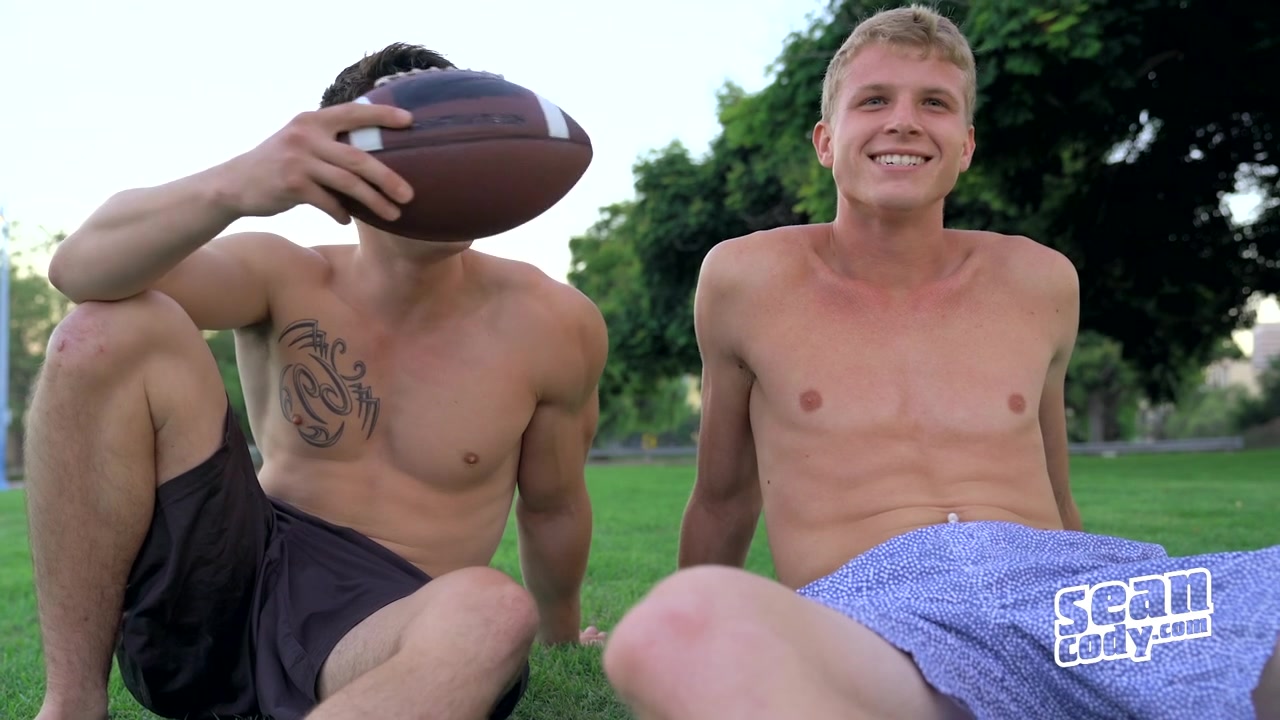 Chiseled, blonde-haired Thomas is looking forward to his first time getting it on with athletic Lane. “What are you most looking forward too?” asks Lane. “I just wanna suck dick. That’s it! That’s what I want!” answers Thomas. “That’s it? We’ll get to that. We’ll round all the bases,” giggles tattooed Lane. “I’ll need you to demonstrate it first though,” says boyish cutie Thomas. “I can do that. I’ll show you the ropes,” replies Lane. They can feel the time to fuck approaching as they get ready to make their way indoors. “Let’s go!” enthusiastically says Lane. “I can’t wait!” replies Thomas.