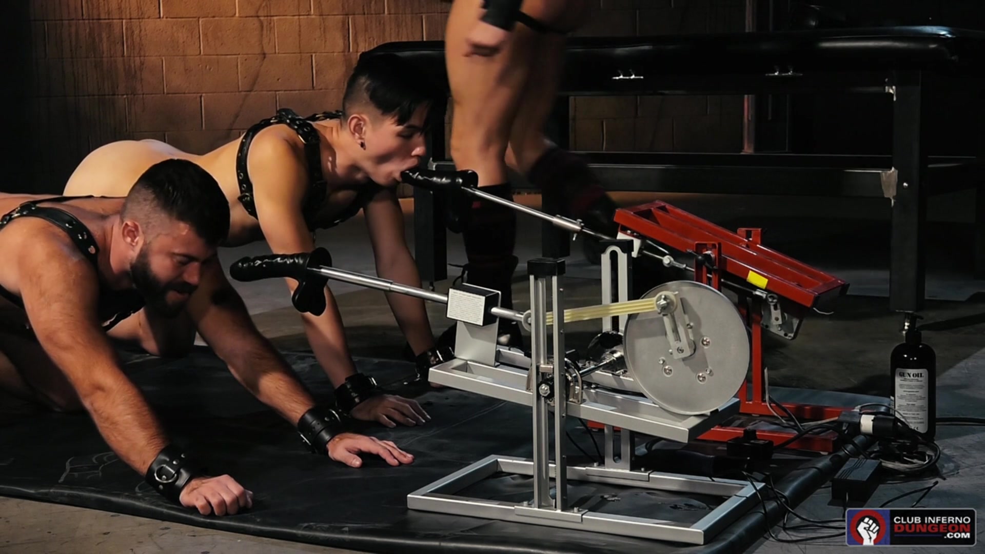 Hairy, muscular Gage Lennox and smooth, lean Issac Lin show off their asses to big, beefy Joey D. Joey has a special surprise for their training session today: twin fucking machines! But first, the boys need to service Joey's cock. They take turns choking on Joey's fat, hard meat, eager to do whatever it takes to please him. Before using the fucking machines to fill their asses, Joey makes Gage and Issac lube up their dildos by showing off their cocksucking skills. When Issac's dong is ready, Joey spins him around and guides the big, black dildo into his hole. As Issac watches, Joey slides his cock into Gage's hole and fucks him as Gage continues to practice his cocksucking on the fucking machine. Saliva drips from Gage's mouth to the floor, forming into a sloppy puddle. With Gage's hole opened up, Joey spins him around and guides him onto the fucking machine. The speed ramps up as Joey feeds his cock to Issac, then to Gage. Joey has one more trick in this session to destroy Joey and Gage's holes. Joey reconfigures the fucking machines so that they penetrate straight up into the air, penetrating more deeply than ever into their eager holes. As the machines reach the limit of their abilities, the boys start begging for daddy's fist - and Joey is eager to give it to them!