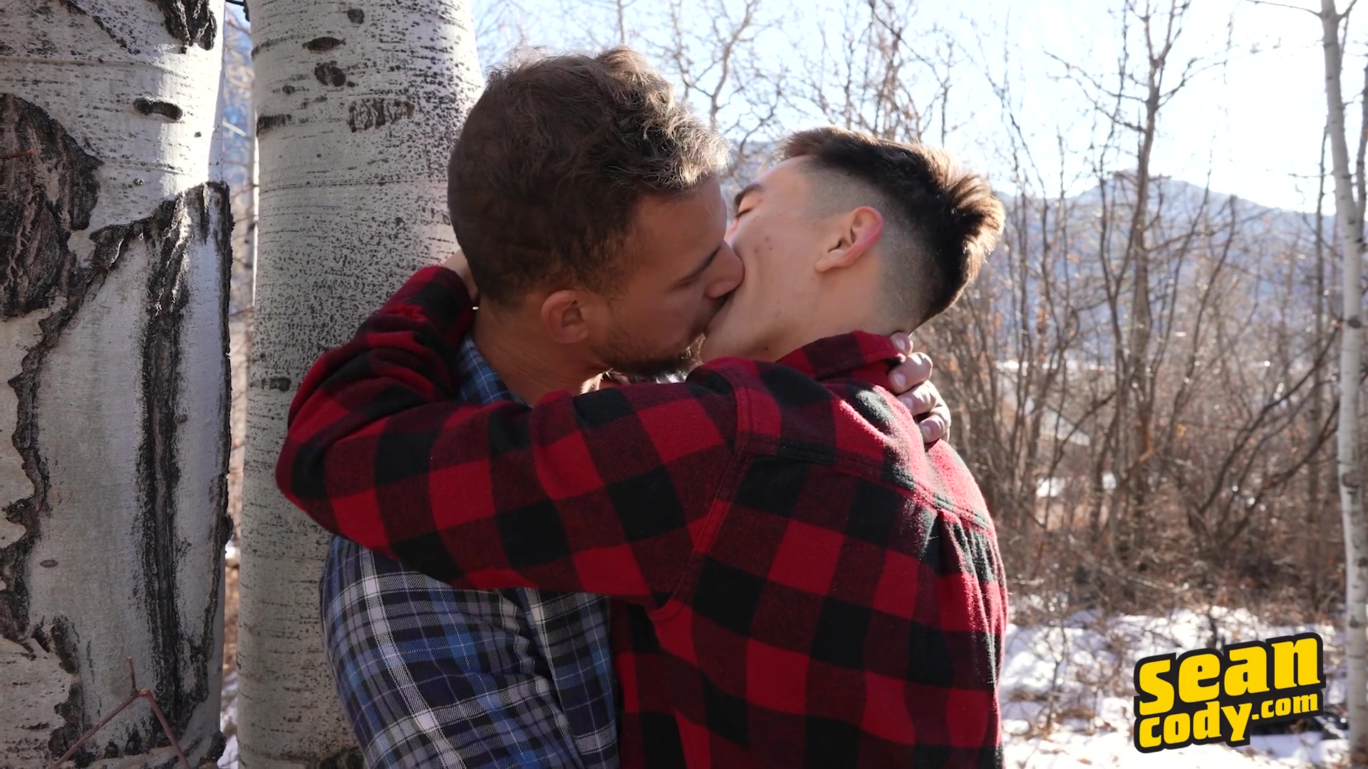 As Devy gets up from his nap and goes out on the balcony to enjoy the scenery while doing some epic air guitar, the other guys downstairs share a snack and swap sex stories. Justin asks, "Have you guys ever fucked outdoors?" and Josh recounts getting it on with 10 people... then getting caught by a hiker! In answer to the question of have they ever fucked in the snow, Cody jokes, "Does snowballing count?" as he eyes up hot top Josh. Cody and Josh head outside, where they start kissing and Cody sucks Josh's dick before getting fucked doggystyle against a tree and bent over the woodpile. Meanwhile, inside, Sean encourages Justin to hook up with Devy, and as the two guys start kissing, Sean sucks both of their cocks. Josh and Cody sneak back inside and upstairs where Cody rides Josh's cock, then they fuck missionary on the bed till they both shoot huge loads. In the kitchen, Sean lies on the counter as both Justin and Devy suck him off till he cums in their mouths!